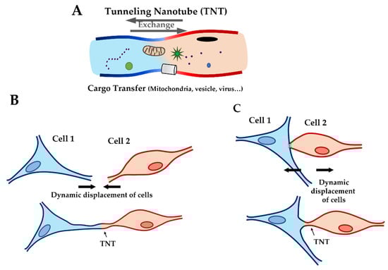 Cartoon showing tunneling nanotubes (TNT). (A) Cargo transfer through TNT with exchange of particles (such as mitochondria, ions, virus…) between two cells. (B) TNT construction by extension of filopodia. (C) TNT construction by contact, formation of TNT after physical contact between two cells and distancing of cells.