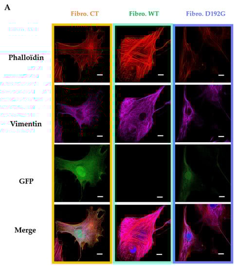 Neonatal rat ventricular fibroblasts (NRVFs) were prepared as (i) non-treated, transfection control NRVFs (Fibro-CT), as (ii) wild type NRVFs (Fibro-WT), and as (iii) NRVFs with LMNA D192G mutation (Fibro-MT). For each condition, actin filaments and intermediate filaments were labeled by immunofluorescence, in order to observe the effect of LMNA D192G mutation on their cytoskeleton. Fibro-MT showed actin network damage which stands out as disorganization of the cytoskeleton when compared with both Fibro-WT and Fibro-CT (Figure 2A).