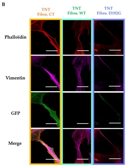 (A) Fluorescence staining of NRVF cytoskeleton. NRVF fluorescence staining in CT, WT, and lamin A/C D192G mutated condition with (i) Phalloidin to target both actin filaments and vimentin intermediate filaments, (ii) DAPI to target the nucleus, and (iii) green fluorescent protein (GFP) used as the transfection control after infection of adenoviral with, or without, the mutation lamin A/C D192 G. Scale bar (white), 10 µm. (B) Fluorescence staining of NRVF nanotubes. NRVF nanotubes’ fluorescence staining in CT, WT, and lamin A/C D192G mutated condition with (i) Phalloidin to target both actin filaments and vimentin intermediate filaments, (ii) DAPI to target the nucleus, and (iii) green fluorescent protein (GFP) used as the transfection control after infection of adenoviral with, or without, the mutation lamin A/C D192 G. Scale bar (white), 10 µm.
