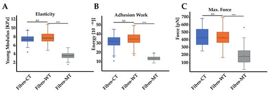 Biophysical properties of living NRVFs. (A) Comparison of elasticity (expressed as Young’s modulus) between NRVFs with the WT adenoviral infection (Fibro-CT), NRVFs wild type (Fibro-WT), and NRVFs with LMNA D192G mutation (Fibro-MT) (nFibro-CT = 61, nFibro-WT = 63, nFibro-MT = 56 analyzed curves, respectively). (B) Cell–cell adhesion energy defined as the energy to separate two NRVFs. (nFibro-CT = 152, nFibro-WT = 221, nFibro-MT = 177 analyzed curves, respectively). (C) Comparison of maximum force in cell–cell adhesion/de-adhesion expresses as the maximum force applied to separate two NRVFs, (nFibro-CT = 152, nFibro-WT = 221, nFibro-MT = 177 analyzed curves, respectively), (*** p < 0.0001, NS = non-significant). Numerical data is divided into quartiles, and a box is drawn between the first and third quartiles, with an additional line drawn along the second quartile to mark the median. The minimums and maximums outside the first and third quartiles are depicted with lines.