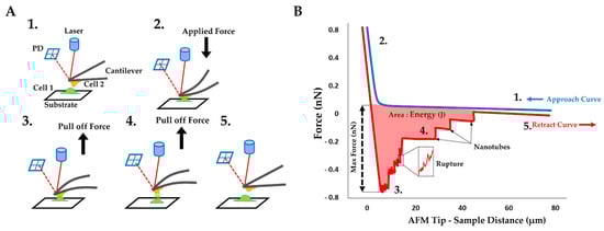 The acquired force curves were analyzed using the JPK Data processing software. The first numerical treatment was the reduction of curve noise, followed by the baseline definition and the tilt correction. After these corrections, several adhesion parameters, identifiable on the retract force curve, were measured, exported, and analyzed (Figure 4B): in particular (i) the total energy applied during the separation of 2 cells, represented by the area under the retracting force distance curve; (ii) the maximum force is the maximum value of the force applied during the separation step; (iii) the rupture pattern which illustrates interaction during short distance separation (0 to 5 µm of piezo withdraw). This pattern is characterized by jumps in the force retracting curve everyone preceded by a slope >20%. These ruptures events were induced by broken adhesion protein link between two cells [,]; (iv) nanotube pattern i.e., nanotubes generated during long-distance separation (5 to 80 µm of piezo withdraw). In this latter case, this pattern of jumps in the retract force curve was preceded by a plateau with <15% derivation and persisting for > 1 μm, representing the force needed to break these plasma membranes, pulled out to form a nanotube between two cells after their contact [,,,]. The distribution of breaking forces was analyzed using OriginPro 9.7 2020 software, and Gaussian function was fitted to highlight a specific population.