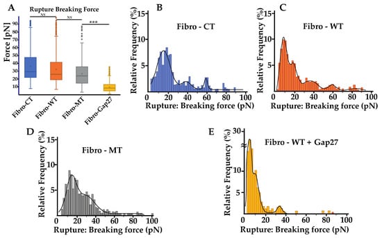 Rupture pattern obtain using the AFM. (A) Comparison of rupture pattern between control, wild type, LMNA D192G mutation, and NRVFs WT incubate with Gap27 (Fibro-WT + Gap 27). Rupture breaking force is the force applied to break the link between the adhesion proteins of two cells in contact during the “short distance (0 to 5 µm)” de-adhesion step. (nFibro-CT = 152, nFibro-WT = 221, nFibro-MT = 177, nFibro-WT + Gap27 = 122 analyzed curves, respectively). (B–E) Rupture breaking force distribution histogram for the different NRVFs conditions. The black curves represent the overall Gaussian fit distributions, (*** p < 0.0001; NS = non-significant).