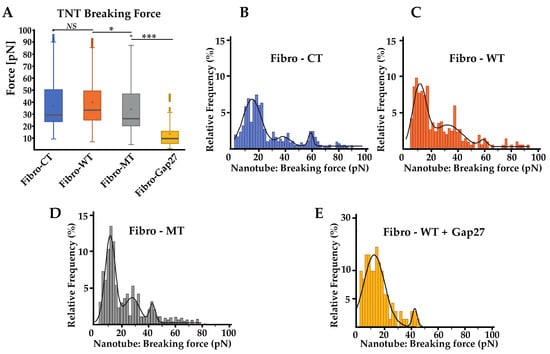 Nanotube pattern obtain using the AFM. (A) Comparison of nanotube pattern between NRVF control and wild type, NRVFs with LMNA D192G mutation and NRVFs WT incubate with Gap 27. Nanotube breaking force represents the force applied to break the link between both cells during the “long distance (5 to 80 µm) de-adhesion steps”. (nFibro-CT = 152, nFibro-WT = 221, nFibro-MT = 177, nFibro-WT + Gap27 = 122 analyzed curves, respectively). (B–E) Breaking force distribution histogram of nanotube pattern in different NRVF conditions. The black curves represent the overall Gaussian fit distributions. (*** p < 0.0001; * p < 0.05, NS = non-significant).