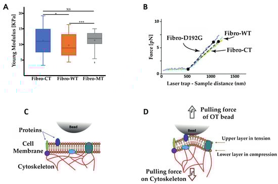 Nanotube extrusion measured using the optical tweezers. (A) Nanotube stiffness (expresses as Young’s modulus) between different conditions NRVFs. (nFibro-CT = 60, nFibro-WT = 58, nFibro-MT = 70, analyzed curves, respectively). (B) Force curve between NRVFs CT, WT, and NRVFs with LMNA D192G mutation. (C) Cartoon showing the resistance force impacting the nanotube extrusion. (D) The pulling force of the OT bead after the interaction with the plasma membrane is counteracted by bending rigidity (with stretching and compression of membrane layer) and surface tension (with pulling force of cytoskeleton), (*** p < 0.0001; * p < 0.05; NS = non-significant).