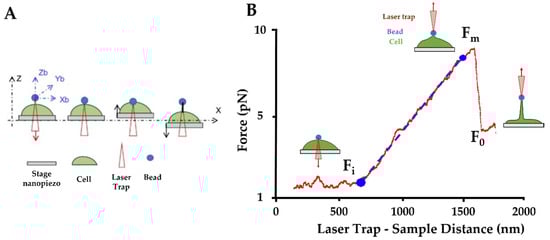 An infrared trapping laser from an Ytterbium fiber laser (YLM-5–1064-LP, IPG Photonics, Oxford, MA, USA) with a wavelength of 1064 nm and maximum power of 5 W at a nominal power of 250 mW (60 mW at the sample) was used. The vertical stiffness of the optical trap was kz = 0.04 pN/nm. A silica microbead of 1 µm diameter (SS04000 Bangs Lab Inc., Fishers, IN, USA) was used to extract the tether membrane. This step was achieved by manipulating the bead to get in contact with the cell, then moving the cell/stage vertically against the bead by 0.5 µm and keeping the contact for 30 s to create the cell adhesion. Finally, a nanotube was extracted by moving the cell away from the bead by 2 µm. Precise displacement of the bead was obtained by moving the optical trap with a Focus Tunable Lens FTL (EL-10-30-C, Optotune AG, Dietikon, Switzerland), as previously described []. The displacement of the cell, which was adhered on the coverslip, was controlled in x-y-z by a 3-Axis NanoMax Flexure Stage (MAX311D/M Thorlabs Inc., Newton, NJ, USA). The displacement of the bead from the center of the trap, which allows us to measure the force, was measured by a Quadrant Detector Sensor (PDQ080A, Thorlabs Inc., Newton, NJ, USA). The vertical force exerted by the tether during extraction was calculated as F = kzB and the length of the tether L was given by the displacement of the nanopiezo. The nanotube’s stiffness was deduced as the slope of the force–tether length (F–L) curve (Figure 8B).