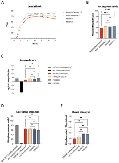 Results of phenotypic experiments. (A) Growth kinetics in LB broth and (B) statistical comparison of area under the curve (AUC) of growth curves. The results are given as mean values and standard deviation of AUCs. (C) Survival in 50% human serum. The results are given as mean values and standard deviation of log2 fold change of CFU/mL after 4 h of incubation in serum. (D) Siderophore production ability (n = 3). The results are given as mean values of siderophore production unit and standard deviation. (E) Determination of mucoid phenotype using sedimentation assay (n = 3). The results are given as mean ratios of OD600 of supernatant after centrifugation at 1000× g for 5 min and OD600 of the overnight culture and standard deviation. For all results the clinical isolates were compared to PBIO1953 (K. pneumoniae, ST307) and hvKP1 (archetypical hypervirulent K. pneumoniae) in variance analyses (one-way ANOVA with Dunnett’s multiple comparison post-hoc test). The significance level (p value) is as follows: ns not significant, * p < 0.05; ** p < 0.01; *** p < 0.001; **** p < 0.0001.