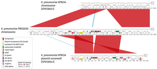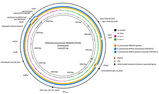 The in silico multi-locus sequence typing (MLST) and antibiotic resistance/virulence gene detection were carried out using mlst v. 2.19.0 (https://github.com/tseemann/mlst (accessed on 09 July 2021)) and ABRicate v. 1.0.0 (https://github.com/tseemann/abricate (accessed on 09 July 2021)), respectively. Both tools rely on third-party public databases (e.g., PubMLST [40], VFDB [41], ResFinder [42], PlasmidFinder [43], BacMet [44]). To visualize genome content, BRIG v. 0.95-dev.0004 [45] and NCBI BLAST v. 2.11.0+ [46] were employed by aligning isolate contigs against the closed reference of PBIO2030. For in-depth typing of yersiniabactin, aerobactin, salmochelin, K locus, and O locus, we used Kleborate v. 1.0.0 with Kaptive [47,48]. A synteny plot comparing the region harboring the chromosomally integrated plasmid with two replicons (chromosome and plasmid) of a publicly available ST420 isolate (K. pneumoniae KPN234; NCBI accessions CP072653.1 and CP072654.1) was created with genoPlotR v. 0.8.9 [49].