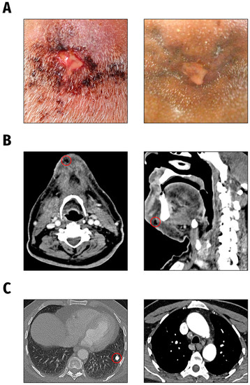 Clinical presentation. (A). Submental wound findings at initial presentation (left) and following antibiotic treatment one month later (right). (B). CT head and neck findings: subcutaneous air accumulation and circumscribed fluid in the chin region. (C). CT chest scan findings: calcified focal lesion in the left lung as well as mediastinal and pulmonary lymphadenopathy.