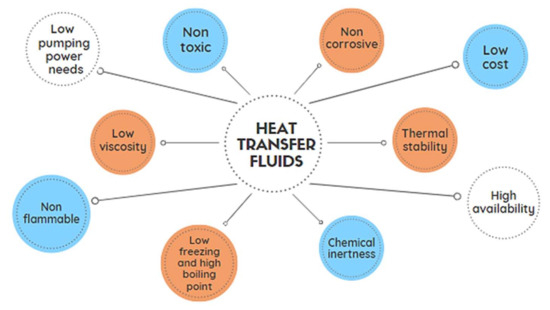 Depending on the field of technology, specific requirements are imposed on the properties of HTFs. For example, in ferrous and non-ferrous metallurgy, high thermal stability is a desirable property in HTFs, while in the space rocket industry, low density and low volatile liquids are required [5,6]. However, there are characteristics that should characterize the fluid used as HTF, regardless of the system in which it is to be applied, as shown in Figure 1. First, the HTFs must show a very good heat transfer capacity in the selected temperature range, i.e., high specific heat and a high thermal conductivity coefficient [1]. In addition, they should be characterized by high thermal and thermooxidative stability, compatibility with construction materials used in heating systems, and non-toxicity [7,8]. HTFs should not be prone to secretion and deposition of sediments on the walls of the system. It is also important to have the appropriate viscosity in the operating temperature range and the pour point adjusted to the conditions to which the system may be exposed [9]. The life charge of the fluid is also important. A good HTF is considered to have a useful life of a charge in the range of 35,000 to 40,000 effective working hours [10]. Currently, a priority trend in heat exchange technology is the search for compounds and the creation of fluid compositions that have the desired combination of key physicochemical properties to solve unconventional problems. Finally, economic features such as the availability and low cost of HTFs should be taken into account.