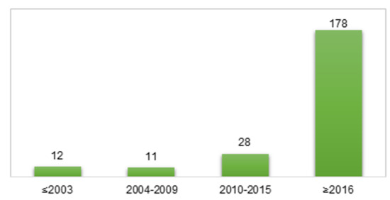 As the topic of heating and cooling is present in practically every area of industry, it is not surprising that for years, heat transfer fluids have attracted a lot of attention. There are many reviews of heat transfer fluids in the literature that have been developed from different viewpoints. Many of them refer to HTFs used in solar power technology [1,11,12,13,14,15,16,17,18], the use of nanofluids and their modifications [19,20,21,22,23,24,25,26,27,28,29,30], and ionic liquids [5,10,31,32,33,34] as HTFs, and the analysis of commercial HTFs [35,36]. However, despite extensive research and analysis, the most popular HTFs in most industrial applications are still conventional media, and no comparison has been made between conventional HTFs and alternative media including nanoparticle-based HTFs in the context of industrial applications. Therefore, the aim of this review is to perform an in-depth comparison of the environmental, technical, and economic characteristics of traditional and nanoparticle-based heat transfer fluids. Furthermore, the possible benefits and limitations and the branch of applications of various HTFs are taken into account. This paper focuses on the latest literature reports (mainly from the last five years) on novel HTFs and compares them with commonly and widely used traditional media. Thanks to this, it is possible to highlight the existing problems in the field of industrial HTFs, as well as to determine the direction in which research on new solutions should go to solve the current limitations. The number of articles cited in our work by years of publication is presented in Figure 2.