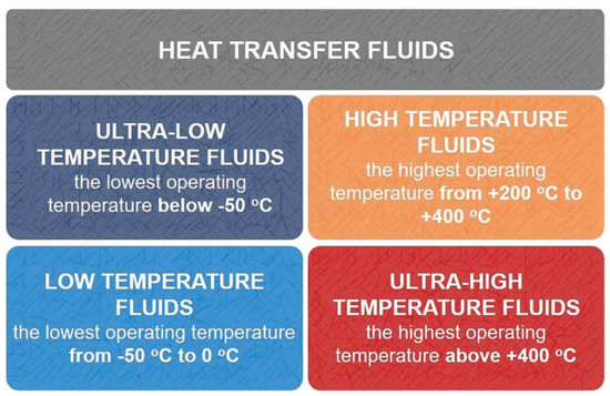 Both liquid and gaseous heat transfer fluids are commonly used, which can be classified into several categories. In terms of the specific applications of HTFs, the classification according to the operating temperature range seems most appropriate. Then, four basic categories of liquids are distinguished [9], which are presented in Figure 3. The most common industrial heat transfer fluids are oil heat carriers, including deeply refined mineral oils with added inhibitors, synthetic polyolefin-type hydrocarbons, aromatic hydrocarbons without alkyl side chains, esters of carboxylic acids and polyhydric alcohols, silicones, silicate esters and alkyl borates [6,37]. Synthetic oils, such as Therminol® VP-1 or Dowtherm® A, offer the widest temperature range in which they can be used [38]. Nevertheless, they are toxic and highly flammable, which poses a threat to both plant operators and the environment [39]. In addition, they have high vapor pressures that significantly exceed the atmospheric pressure. This makes their use as thermal storage media difficult due to the necessity to apply impractically large pressure vessels [40]. Furthermore, heating oils as heat carriers should only be used in systems with forced circulation. Systems using only natural convection do not provide enough rapid flow to prevent local overheating and decomposition of the oil. Therefore, finding an alternative to replace the currently implemented HTFs is an important issue that allows for reducing risk, but also reducing costs and improving the efficiency of installations [36]. This chapter briefly characterizes conventional HTFs with regard to their major disadvantages, advantages, and limitations, their thermophysical properties, and the applications in which they are used.