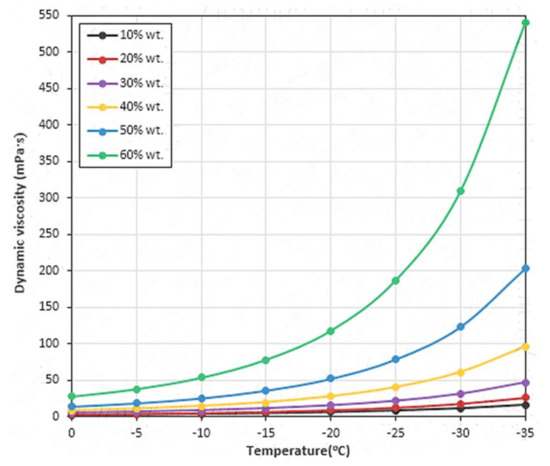An alternative to glycols is glycerol due to its non-toxicity and easy biodegradability [72]. Aqueous glycerol solutions are commonly used as heat transfer agents having indirect food contact during rapid freezing in the food industry [73]. However, glycerol and its aqueous solutions are characterized by high viscosity at low temperatures [74,75]. Figure 4 presents graphs of the relationships of dynamic viscosity of aqueous glycerol solutions on temperature (in the low range) and on the mass concentration of glycerol. Despite the fact that increasing the content of glycerol in the mixture with water causes a decrease in the freezing point, which results in an increase in the possible range of applications as an HTF, on the other hand, it causes a drastic increase in the solution viscosity, especially at the concentration value of 40 wt% and more, which is an undesirable phenomenon. The properties of glycerol–ethylene glycol–water mixtures were also investigated in terms of their use as HTFs. The solution that contained 40 wt% water and 60 wt% of glycerol–ethylene glycol mixture with a composition of 71.4 wt% glycol and 28.6 wt% of glycerol was characterized by the lowest pour point, which equaled −49.84 °C [76]. However, the greatest problem with such solutions is the high viscosity.