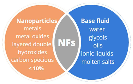 The first and vast group of novel transfer fluids is nanofluids (NFs) with a solid–liquid composition. In this system, nanoparticles (NPs) with an average size below 100 nm, for example, metals, metal oxides or hydroxides, and carbon compounds, are suspended in the base fluid such as water, oil, glycol or a water–glycol mixture, as is shown in Figure 5. An advantage of selecting water-based NFs is their non-toxic nature. Generally, the concentration of nanoparticles in the base fluid does not exceed 10%. The assumption of this technology is the incorporation of solid NPs that possess much higher thermal conductivity (TC) than the base fluid, which therefore can improve the heat transfer coefficient (HTC) [78,79]. Heat transfer improvement of nanofluids may be related to energy transfer by means of nanoparticle dispersion, Brownian motion of particles, particle migration, ballistic phonon motion, reduction in boundary layer thickness, and delay in the boundary layer’s development [27,80,81]. Iacobazzi et al. [82] investigated the effect of various mechanisms (layering, Brownian motion, clustering, ballistic phonon motion, thermal boundary resistance and mass difference scattering) on the thermal conductivity of NFs. For the first time, the authors suggested the examination of the effect of mass difference scattering. This mechanism was examined because it was the most intensive mechanism reducing the TC value of nanofluids, compared to that of microfluids. In the study, Milanese et al. [83] observed that layering phenomena could be different for metal and metal oxide NPs. In the presence of Cu NPs, two shell-like formations of water molecule layers were noticed, while for CuO, this phenomenon did not occur. This might explain the higher improvement of TC for Cu-based NF than for CuO NF.