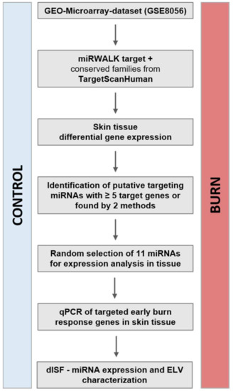 Study concept and workflow. From the publicly available dataset of GSE8056, we compared the groups for control (no burn) and the sample pools of up to 3 days after the burn wound. The genes with a padj < 0.001 were considered the genes of the early burn response. The miRNAs putatively targeting these mRNAs were identified via the bioinformatics approach (miRWalk target, TargetScanHuman). Selected miRNAs and the early burn response genes they target were analyzed in a human skin model for burn injuries. The miRNAs in human dISF were characterized. Abbreviations: GEO, Gene Expression Omnibus; miRNA, microRNA; qPCR, real-time quantitative PCR; padj, adjusted p-value; dISF, dermal interstitial fluid; ELV, exosome-like vesicles.