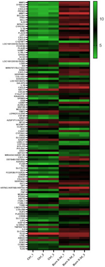 To identify regulated miRNAs after burn injuries, we set up a bioinformatics approach and analyzed publicly available GEO datasets from transcriptomic studies of biopsies collected from burn patients. To do so, the NCBI-GEO database [27] was screened for expression data in the early phase of partial-thickness burns of human skin biopsies. The GEO-dataset GSE8056 [25] was considered the most suitable at the time of the analysis. It included microarray data of 12 samples, three per group, each consisting of the pooled RNA of five patients. We compared three sample-pools from 0 to 3 days after the burn injury, with the three corresponding control sample-pools. Of the 54,675 annotated genes in the analyzed dataset, 3558 (6.5%) were differentially regulated with an adjusted p-value (padj) of < 0.05, 992 (1.8%) with padj < 0.01 and 114 (0.2%) with padj < 0.001 (Table 1). These highly significant early burn-response genes (differentially regulated genes with padj < 0.001) (Table 2) were depicted in a heatmap (Figure 2) and considered for further analysis steps. Among these genes of the early burn response were matrix-associated genes, such as matrix metalloproteases (MMP) and collagens (COL); immunomodulatory genes, such as members of the interleukin (IL) and chemokine (c-x-c motif) ligand (CXCL) families; signal cascade transducers that activate various major cellular pathways; and several others. Of the 114 genes, 79 were upregulated in burn samples (70%) and 35 were downregulated (30%) (Table 1). This is also visualized in the volcano plot (Supplementary Materials Figure S1a) and Venn diagram (Supplementary Materials Figure S1b).