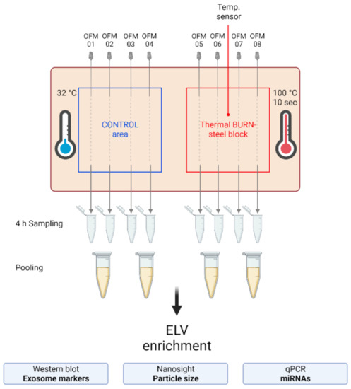 Experimental setup of the dISF sampling with dOFM in an ex vivo human skin model for burn injuries. OFM probes were inserted into ex vivo human skin at the control area (OFM 1–4) and burn area (OFM 5–8), where a steel block of 100 °C was applied for 10 s to provoke a thermal burn. A temperature sensor inserted into the skin enabled the control of temperature at the burn area. OFM was sampled over 4 h. Samples from 2 adjacent probes were pooled. The collected dISF was centrifuged at increasing speeds to enrich ELVs for further experiments.