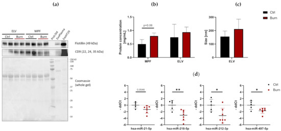 To investigate the presence and characteristics of ELVs in the dISF of burn injuries, dOFM was performed as previously described [21,28,29], and ELVs were enriched through centrifugation (Figure 3). To verify the presence of ELVs, the exosomal markers flotillin and CD9 were detected in ELV-enriched fractions and mixed particle fractions (MPF) of burned skin and control skin (Figure 4a). There were no changes in the CD9 signal in the ELV-enriched fraction. A slight decrease in CD9 was present in the MPF of burned skin. Protein concentrations in the MPF were 0.8 mg/mL in burn samples and 0.5 mg/mL in control samples (p = 0.06). There were no changes in protein concentrations in the ELV-enriched fractions of burn sites (Figure 4b). Particle sizes in ELV-enriched fractions were not altered in the dISF of burned skin (Figure 4c and Supplementary Materials Figure S2).