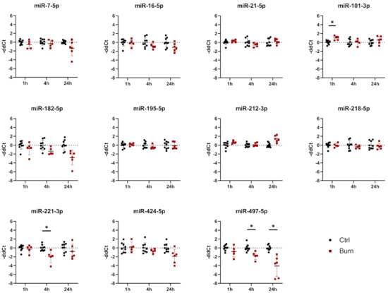 Expression of 11 selected miRNAs in skin biopsies putatively targeting early burn-response genes. Data are derived from 3 independent experiments and presented as individual values of –ddCt, normalized to SNORD 48 and U6 and expressed relative to control, with means (line) and standard deviation (whiskers). Significance was tested with Student´s t-test, followed by Bonferroni correction; p-values < 0.05 were considered as statistically significant, with * indicating p < 0.05.