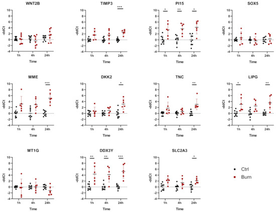 In tissue, we analyzed 11 miRNAs out of the 43 miRNAs identified. We analyzed miR-7-5p, miR-16-5p, miR-21-5p, miR-101-3p, miR-182-5p, miR-195-5p, miR-212-3p, miR-218-5p, miR-221-3p, miR-424-5p and miR-497-5p in tissue biopsies (see Figure 5 and Table 3). We found that all 11 analyzed miRNAs were expressed in skin biopsies, with three of them differentially expressed in a time-dependent manner (Figure 5). Of the 11 analyzed early burn response genes, eight showed differential expression at least at one time point (Figure 6). DEAD-box helicase 3 Y-linked (DDX3Y), peptidase inhibitor 15 (PI15) and endothelial lipase (LIPG) showed upregulation in burned tissue after 1 h. TIMP Metallopeptidase Inhibitor 3 (TIMP3), Dickkopf-related protein 2 (DKK2), membrane metalloendopeptidase (MME), tenascin C (TNC) and solute carrier family 2 member 3 (SLC2A3) showed an increase in expression at 24 h. There were no differences observed for the expressions of WNT2B, a member of the wingless-type MMTV integration site (WNT) family, SRY-Box transcription factor 5 (SOX5) and metallothionein-1G (MT1G) within the first 24 h post-burn (Figure 6).
