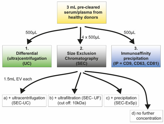 Schematic summary of EV isolation workflow. A total of 3 mL serum or plasma was precleared and split into 500 µL aliquots for subsequent EV isolation with (1) differential (ultra)centrifugation (UC), (2) size exclusion chromatography (SEC), or (3) immunoaffinity precipitation (IP). SEC was performed four times with 500 µL plasma/serum each. Collected fractions (8–10) were first pooled (4 × 1.5 mL = 6 mL), and 1.5 mL aliquots EV suspension was used for each following concentration step.