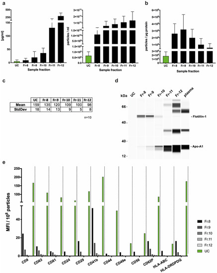 Simple Western immunodetection confirmed the presence of the EV markers flotillin-1 (Figure 2d) and TSG101 (Figure S1a) in SEC-EV fractions 8–10, confirming that these fractions contain EV. Almost no signal was obtained for fractions 11 and 12, suggesting no relevant numbers of EVs to be present in these fractions. The unspecific bands in fractions 11 and 12 emphasize the high levels of non-vesicular proteins, which corresponds to the increasing amount of apolipoprotein A1 (Apo-A1) (Figure 2d). While Apo-A1 was not detectable in the UC-EV sample, the protein was found in the SEC fractions in increasing amounts. Nonetheless, Apo-A1 was reduced up to 130,000-fold (fraction 8) compared to plasma concentrations (Figure S1a). There was no significant protein signal from calnexin (a marker of vesicles originating from the endoplasmic reticulum) in any of the fractions. UC-EVs only gave a weak signal for TSG101 and no signal for flotillin-1, most likely because they were below the limit of detection owing to the low concentration of EVs (Figure S1a).