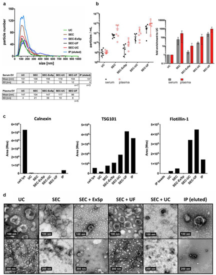 Characterization of EVs isolated and enriched with different strategies. (a) NTA of EVs isolated by UC, SEC, SEC-ExSp, SEC-UC, SEC-UF, or IP demonstrated comparable particle sizes for all EVs isolated from plasma or serum. Depicted is one representative experiment. (b) Quantitative analysis of EVs by NTA showed the lowest concentration for UC-EVs and greatest loss of EVs (after SEC) for the SEC-ExSp combination (left); fold enrichment of particle concentration compared to UC. (right) (c) Simple Western immunodetection of TSG101, flotillin-1, and calnexin demonstrated strong EV marker enrichment in SEC-UC-EVs and SEC-UF-EVs and confirmed the purity of the EVs based on the lack of the ER protein calnexin. Figure S2 shows the corresponding Simple Western immunodetection image. (d) Transmission electron microscopy shows a typical shape and size for EVs in all samples, irrespective of the isolation or enrichment strategy used.