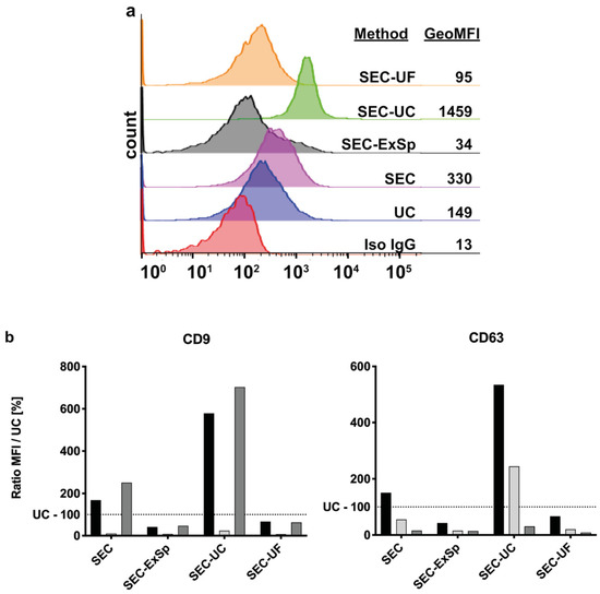 Bead-assisted flow cytometry: 100 µL of each EV suspension isolated by UC or SEC were incubated with 4 µL carboxylated polystyrene beads (4.42 µm, 5 × 107 beads/mL; Polysciences, Warrington, PA, USA) overnight at 4 °C on rotation. The concentration of the beads was chosen to be as low as possible and still be able to acquire enough events for a valid statistical analysis (5000). Next, the beads were blocked by adding an equivalent volume of PBS supplemented with 2% BSA and incubated for 1 h at RT, shaking at 800 rpm. Bead-coupled EVs were split into wells and primary antibodies (anti-CD9: clone HI9a, anti-CD63: clone H5C6, iso-IgG: clone MOPC-21; all BioLegend, San Diego, CA, USA) were added to a final dilution of 1:100. After 20 min incubation at RT, the beads were pelleted by centrifugation at 800× g for 3 min and washed twice with 200 µL PBS (containing 1% BSA, 0.1% sodium azide) and then stained with 1:200 diluted PE-labeled secondary antibody (goat-anti-mouse: clone Poly4053; BioLegend) for 20 min at RT. The washing steps were repeated, and the beads were analyzed immediately. Gating of beads was performed based on FSC/SSC parameters, which allowed for the exclusion of possible unbound EV-antibody aggregates as well as bead-doublets from the analysis. Data were acquired with LSRII or FACSCanto (both BD Biosciences, San Jose, CA, USA) and analyzed with FlowJo software, version 10 (BD Biosciences). The geometric mean fluorescence intensities were background-corrected and negative values were excluded from the plot.
