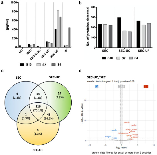Variable protein detection depending on the EV isolation method (a,b) Differences in protein concentration and protein detection of EVs separated by different methods from human serum of three healthy volunteers (S10, S7, and S4). The highest protein concentration was obtained with SEC-UF (two-way ANOVA: p = 0.0002, reference: UC). (c) Representative Venn diagram (from volunteer S10) of proteins detected with SEC alone or when followed by concentration with UC and UF. Note the high number of shared proteins (n = 216, 70.6%) and that 24.7% of the proteins were detectable only after concentrating the EV sample with either UC or UF. (d) Significant, differentially identified proteins with SEC and SEC-UC. When applying filters of q < 0.05 and a fold-change of at least 1.2 (shown with dotted lines), only 14/256 proteins were differentially identified. Out of these, only 9 proteins showed an up- or down-regulation in at least 2/3 samples (see Table 1A). In total, 14 proteins were detected at different levels in SEC and SEC-UC, out of which n = 11 differed significantly in at least 2/3 donors (n = 6 increased and n = 3 decreased in SEC-UC compared to SEC). The six significantly increased proteins in SEC-UC vs. SEC were mainly Ig-related or structural proteins. In SEC-UF, three apolipoproteins were significantly reduced compared to SEC alone in at least 2/3 donors (Table 1).