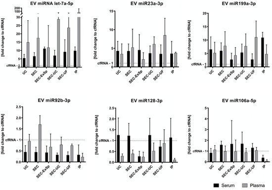 miRNA expression levels in EVs according to the different separation and concentration methods. Depicted is the fold-change of each miRNA compared to the total RNA from cell-free serum/plasma of three healthy volunteers. No significant differences between the EV separation methods were observed, but there was a high and significant variability between individuals for 4 out of 6 miRNAs (let-7a-5p: p = 0.002, miR-92b-3p: p = 0.01, miR-199a-3p: p = 0.01, and miR-128-3p: p = 0.001; two-way ANOVA). Note that let-7a-5p, miR-23a-3p, and miR-199a-3p consistently showed higher levels in EVs compared to the corresponding cell-free samples, as opposed to miR-92b-3p and miR-128-3p.