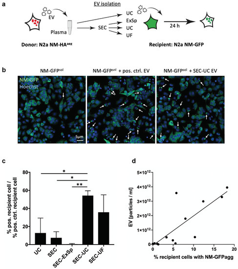 To test whether the isolated EVs were functional with respect to cargo delivery, we made use of our recently established murine cell assay that relies on the induction of reporter protein aggregates in recipient cells upon exposure to EV derived from donor cells propagating protein aggregates composed of the prion-like domain NM of S. cerevisiae Sup35 [29]. Recipient cells normally express soluble GFP-tagged reporter protein NM (NM-GFPsol). Upon exposure to NM aggregate-loaded EV, donor aggregates gain access to the cytosol, where they act as seeds that induce aggregation of the reporter. Induction of NM-GFP aggregates (NM-GFPagg) thus demonstrates functionality of EV fractions [29]. Interestingly, aggregate induction efficiency of SEC-UC-EV (measured by cells with NM-GFPagg) was significantly higher (54 ± 4% of pos. ctrl, p = 0.015 with SEC as a reference) than of EVs isolated by all other methods, except for SEC-UF (35 ± 16% of pos. ctrl; p = 0.153 with SEC as a reference, Figure 7c). The latter showed a non-significant trend towards higher efficacy in NM-GFP aggregate formation compared to EVs from SEC, UC, and SEC-ExSp (Figure 7c). A comparison to NM-GFP aggregate formation induced by the positive control (not spiked into samples) reveals that the spiked-in EVs could not completely recover the activity of EVs isolated from conditioned medium (indicated as 100%, Figure 7). Again, SEC followed by precipitation (SEC-ExSp) was the least effective strategy (0.5 ± 0.5% of pos. ctrl). We found a high correlation between NM-GFP aggregate formation and EV particle concentration (Spearman r = 0.85; p = 0.0003) (Figure 7b). EVs from the plasma of healthy volunteers co-isolated with the applied EV isolation strategies had no impact on spontaneous NM-GFP aggregate formation (data not shown). Thus, except for SEC-ExSp, we were able to recover functional EVs with all procedures, albeit to different degrees.