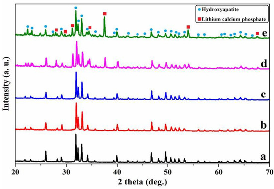 XRD pattern of: (a) HA. (b) HA-0.5Li. (c) HA-1Li. (d) HA-2Li. (e) HA-4Li sintered at 1250 °C.