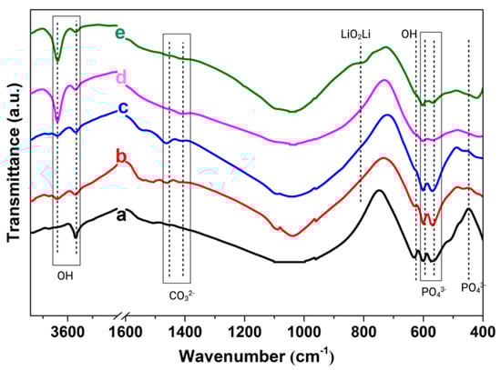 FTIR spectrum of: (a) HA. (b) HA-0.5Li. (c) HA-1Li. (d) HA-2Li. (e) HA-4Li sintered at 1250 °C.