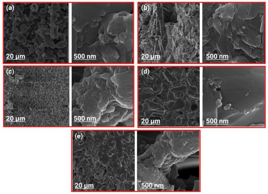 FE-SEM micrograph of: (a) HA. (b) HA-0.5Li. (c) HA-1Li. (d) HA-2Li. (e) HA-4Li powder before sintering.