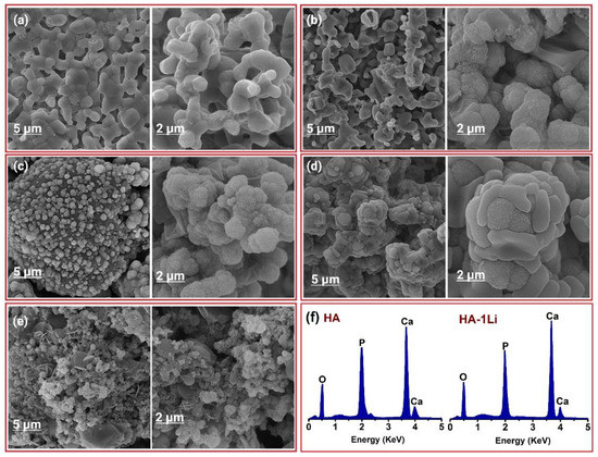 SEM micrograph of: (a) HA. (b) HA-0.5Li. (c) HA-1Li. (d) HA-2Li. (e) HA-4Li after soaking in SBF for 7 days and (f) the EDS of HA and HA-1Li.