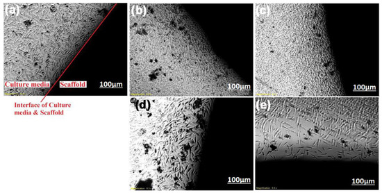 To evaluate apatite growth ability, samples were immersed in 20 mL SBF prepared according to the extensively used recipe by Kokubo [89]. The ionic concentrations in SBF were almost like human blood plasma. The specimens were stored in an incubator for 7 days at 37 °C. During the incubation period, the SBF was refreshed every day. After the 7th day, they were washed in deionized water (DI) and dried at room temperature. Afterward, the samples were analyzed by scanning electron microscopy (SEM, Tescan, Brno, Czech Republic) and EDS to observe the formation and growth of bioactive apatite.