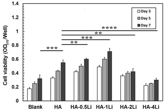 Optical density of cell seeded on: HA; HA-0.5Li; HA-1Li; HA-2Li; HA-4Li. (** for p < 0.01; *** for p < 0.001 and **** for p < 0.0001).