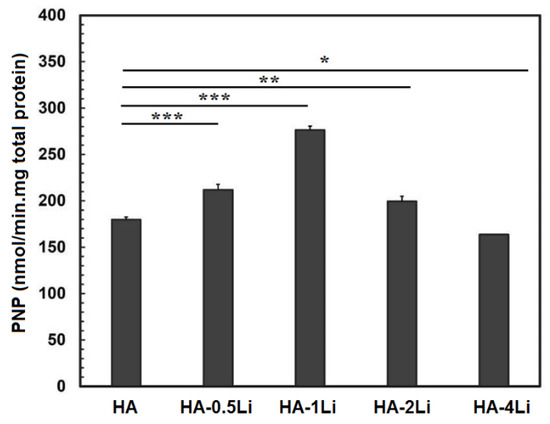 Alkaline phosphatase activity of cells on the HA and HA-Li scaffolds on day 7. (* for p < 0.05; ** for p < 0.01 and *** for p < 0.001).