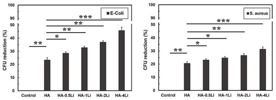 Figure 9 shows the results of antibacterial tests against the two E. coli and S. aureus bacteria. Li doping enhanced the antibacterial properties of HA nanoparticles. Moreover, the E. coli bacterium had lower resistance than S. aureus.