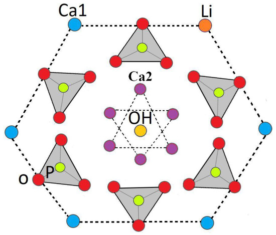 Cation substitution upon doping the HA structure gave rise to changes in the phase composition, biological and antibacterial properties, degree of crystallinity, and grain size. The crystalline structure of HA could be stabilized or destabilized due to the ionic radius of the substituted dopant. The reason for adding any dopants into the HA structure is to improve morphology and densification [41,42]. Based on XRD characterization (Figure 1) and Table 1 and Table 2, HA allows the substitution of dopant in its structure, and thus, its lattice parameters changed. The HA-2Li and HA-4Li samples showed less lattice volume variations. This can be attributed to the formation of Ca10Li(PO4)7 phase, and consequently, the placement of Li+ in the HA structure [8,43]. To explain this, it is important to know where the Li ions were placed in the HA structure. The sites depicted in Figure 10 are the locations that can be filled by the dopant ions in the HA structure. Depending on the ionic radius, a dopant can replace Ca2 or Ca1 sites. The cations with a radius larger than the Ca ion would fill Ca2 and the smaller cations in Ca1 sites. As mentioned before, Li+ has a smaller ionic radius than Ca2+; therefore, it was substituted in the Ca1 places or inserted as an extra atom in the HA structure (interstitial atom) [44,45]. Considering Table 2, due to the formation of another phase (Li-calcium-phosphate) at higher concentrations of Li+, the crystallinity of HA decreased because there were not as many Li ions to substitute the Ca ions [7,8]. According to Table 2, the size of HA crystals can be explained as follows. First, the addition of Li (0.5 and 1.0 wt.%) resulted in a more compact structure and smaller crystal size. Second, at the higher Li contents (2.0 and 4.0 wt.%), Li-calcium-phosphate phase formation consumed some of the Li+, resulting in lower Li+ available for doping in the HA structure. This resulted in lower densification of the HA lattice causing an increase in the HA crystal size [8,43,46]. Moreover, as shown in Figure 3, the grain growth of HA-2Li and HA-4Li samples before sintering was due to the formation of a liquid phase containing Li and Ca phosphates [47]. After sintering (Figure 4), the densification was increased in HA-0.5Li and HA-1Li samples because Li+ is small and caused higher diffusion. Considering a study by Lee et al., the higher Li doping provoked more grain growth by diminishing the grain boundary energy [48,49].