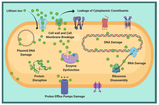 According to the antibacterial results against E. coli and S. aureus in Figure 9, the bacterial viability decreased by increasing Li ion dopant in the HA structure. Because gram-negative bacteria (E. coli) have a thinner peptidoglycan layer than gram-positive bacteria (S. aureus), the entry of Li+ into E. coli and structural damage were less limited [35]. In other words, the purines in the outer layer of gram-negative bacteria acted as a channel for the entry of low molecular weight substances; consequently, the amount of damage to E. coli was higher at similar Li contents [79,80,81]. The results of electron microscopy in previous research have shown that bacteria lose their natural shape upon exposure to the metal, related to metal accumulation on the bacterial cell wall [82]. The schematic displayed in Figure 12 shows possible Li function in the face of bacteria. In general, Li destroys the cell wall, leading to leakage of cytoplasmic contents and dehydration [83]. Moreover, the entry of Li ions into bacteria can damage polynucleotide chains such as RNA and DNA. Li disrupts the function of enzymes by altering the conformation of proteins [83,84].