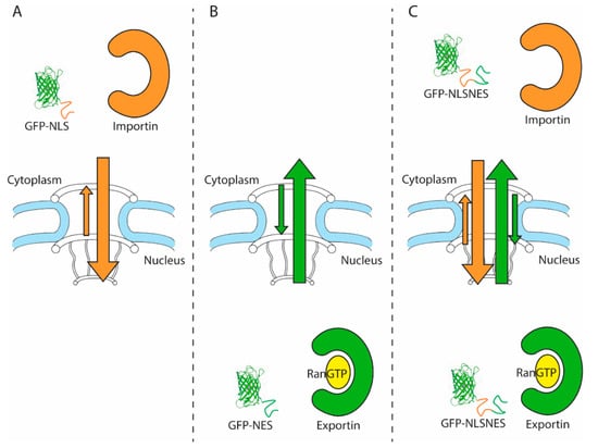 Nucleocytoplasmic transport can be measured with fluorophore-tagged transport reporters. (A) GFP tagged with an NLS accumulates in the nucleus owing to constant active import, which is faster than the passive leak in the opposite direction. (B) GFP tagged with an NES accumulates in the cytosol owing to constant active export, which overpowers passive influx. (C) GFP tagged with both an NLS and NES sequence accumulates depending on the strongest signal, as it is both actively imported and exported and passively diffuses across the nuclear pore. Passive diffusion (=influx and efflux) is dependent on the concentration gradient of the reporter, the number of NPCs, and their permeability.