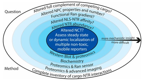 An overview of the questions related to answering whether nucleocytoplasmic transport is altered in a disease model; questions are shown in the top half of the image and methods are shown in the bottom half. The centre circle represents the main question of whether or not NCT is altered; this question can be answered by comparing the localization of transport reporters to either the nuclear or cytosolic compartment in wild type and disease models. The reporters have to be non-toxic, mobile, and preferably multiple NLS- or NES-containing reporters representing different transport pathways are used. To answer how NCT is altered, different additional questions have to be answered represented in layers of increasing complexity. In the case of the outermost layers, we enter into what is presently still largely uncharted scientific territory.