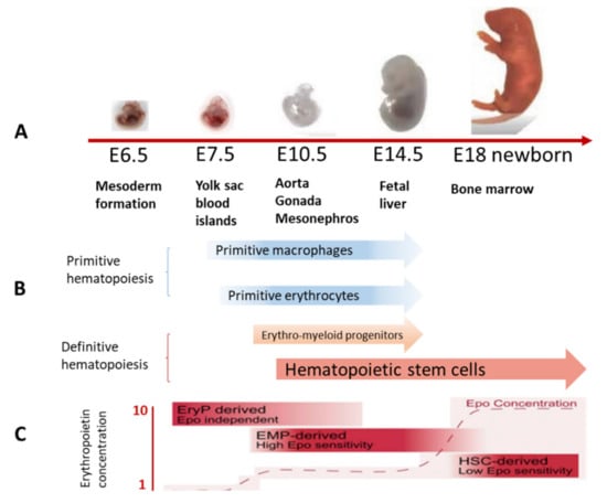 Hematopoiesis in the embryo. (A) Sequential change of sites of hematopoiesis in the embryo. (B) Timing of primitive and definitive hematopoiesis. (C) Megaloblastic erythroid precursors and fetal erythropoietin levels. Adapted from [,,].