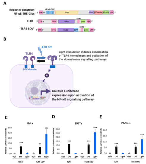 Transient co-transfection of either TLR4 or TLR4-LOV with the NF-κB-TRE-Gluc reporter into HeLa, 293Ta, and PANC-1 proved the functionality of the engineered constructs, as light exposure induced high NF-κB activation in cells transfected with TLR4-LOV, but not with TLR4. In contrast, LPS stimulation activated NF-κB activity in both, TLR4 and TLR4-LOV transfected cell lines.