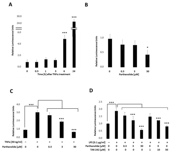 A total of 20,000 PANC-1 NF-κB or opto-TLR4 PANC-1 cells were cultivated in 96-well plates (Sarstedt, Nümbrecht, Germany; 833924300) for 24 h (37 °C and 5% CO2) and treated with 30 ng/mL human tumour necrosis factor-α (TNF- α; Merck, Darmstadt, Germany; T6674-10UG), 0.1-1 µg/mL lipopolysaccharides from Escherichia coli O55:B5 (LPS; Merck, Darmstadt, Germany; L4524-5MG), 0.3-30 µM parthenolide (PAR; Abcam, Cambridge, United Kingdom; ab120849), 5-100 µM TAK-242 (resatorvid; Merck, Darmstadt, Germany; 614316-5MG), a combination thereof, or left untreated and incubated for 6-48 h at 37 °C and 5% CO2 in a humidified atmosphere.