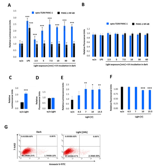 To test the light-inducible TLR4-LOV dimerisation/activation and subsequent signal transduction (NF-κB-Gluc), the selected clone, opto-TLR4 PANC-1, was pre-incubated overnight in serum-free culture medium and exposed to light at 470 nm for 0–60 min using the Amuza LED Array System, followed by incubation in the dark (Figure 3A). After 6 h, NF-κB signalling was determined by measuring Gluc. As depicted in Figure 3A, light exposure of opto-TLR4 PANC-1 at 470 nm and 7 V indicated a time-dependent Gluc activity peaking after 7.5 min (2.5-fold). Importantly, only opto-TLR4 PANC-1 showed Gluc activity after light exposure compared to PANC-1 NF-κB (reporter), but both cell lines could be stimulated with LPS (Figure 3A). Additionally, no change in cell viability (PrestoBlue) could be observed (Figure 3B). To investigate whether prolonged exposure or the change in voltage has an impact on TLR4-LOV/ NF-κB-Gluc reporter activity and cell viability, cells were continuously illuminated at 470 nm for 12 h at 7 V (Figure 3C,D) or stimulated for 7.5 min at 4.5-, 7-, 10- and 13-volts, followed by incubation for 6 h in the dark (Figure 3E,F). Subsequently, promoter activity and cell viability were measured. Interestingly, prolonged light exposure (12 h) or increased voltage (10 and 13.5 V) did not boost reporter activity compared to 7 V and 7.5 min; however, light intensity at lower voltage (4.5 V) indicated reduced reporter activity. In contrast, an applied voltage higher than 7 V already diminished cell viability significantly after 6 h. This observed effect is most likely due to accumulating heat and the factor of time (Figure 3F). To exclude that light at 7 V impairs cell viability, cells were exposed to light for 24 h and apoptosis and necrosis of cells were measured using annexin V and 7-AAD. No significant toxicity was detected (Figure 3G).