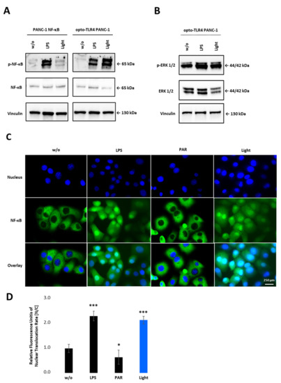 To confirm NF-κB activity after light stimulation, phosphorylation of p65 in PANC-1 NF-κB and opto-TLR4 PANC-1 cells was evaluated. As shown in Figure 4A, light stimulation at 470 nm for 7.5 min, and subsequent incubation in the dark for 20 min, significantly increased p65 phosphorylation on Serine 529 in opto-TLR4 PANC-1 cells, but not in PANC-1 NF-κB cells. In contrast, LPS treatment (100 ng/mL) for 30 min induced p65 phosphorylation in both cell lines. Additionally, phosphorylation of ERK was only marginally increased after light or LPS stimulation compared to negative control in opto-TLR4 PANC-1 cells (Figure 4B). When measuring nuclear localisation of stained p65 (nucleus/cytoplasm), light (470 nm, 7.5 min) or LPS (100 ng/mL) induced p65 translocation two-fold compared to untreated cells, whereas NF-κB inhibition with Parthenolide (3 µM) reduced p65 localisation of 40% (Figure 4C,D).