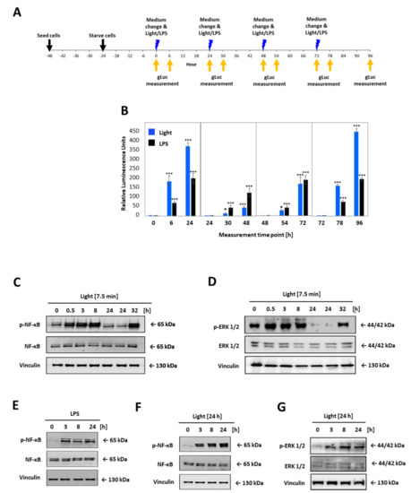 Comparative time-curve and re-activation analysis of opto-TLR4 PANC-1 cell line. Cells were exposed to light at 470 nm for 7.5 min or treated with 100 ng/mL LPS and incubated for 24 h in the dark before cells were again stimulated with light or LPS, respectively. Gluc was measured 6 h and 24 h after each stimulation. (A) Timeline for opto-TLR4 PANC-1 cell seeding, treatment, and imaging. (B) Gluc activity. Western blots of whole-cell extracts of opto-TLR4 PANC-1 cell line after light exposure (470 nm) for 7.5 min at timepoints 0 and 24 prior to extraction of proteins. Blots were probed with antibodies against (C) phospho-p65, total p65, or (D) p-ERK1/2, ERK1/2, and vinculin as loading control. Cells were treated continuously with LPS (100 ng/mL) or with light (470 nm) for 24 h and cell extracts were blotted and probed with antibodies against (E,F) phosphor-p65 p65, and (G) phospho-ERK1/2, ERK1/2, and vinculin as loading control. Post-ANOVA multiple comparisons relative to the control were performed using Dunnett’s test. Error bar = SD. n = 6; * p < 0.05; *** p < 0.001.