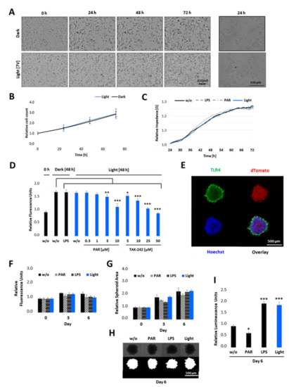 Since TLR4-mediated signalling has been reported to be responsible for cell survival, cancer progression, invasion, and metastasis [9,10,12], we next developed phenotypic assays in order to better understand the complex interplay of tumour progression and the TLR4 signalling pathway. First, we studied the role of light-induced TLR4 signalling in cell proliferation and survival in 2D cultures. Therefore, opto-TLR4 PANC-1 cells were allowed to attach to collagen type I coated wells for 24 h before cells were exposed to light, left in the dark, or were stimulated with LPS or PAR. Then, cell proliferation/viability was measured. As such, we observed that neither light exposure nor treatment with LPS or PAR influenced cell viability or proliferation significantly, as detected by light microscopy (Figure 6A) or monitored in real time by means of measuring the changes in impedance over time (Figure 6B). Next, cells were stimulated with LPS, left in the dark, or were exposed to light with additional PAR and TAK-242 treatment in different concentrations for 48 h, and cell viability was measured using PrestoBlue assay. As depicted in Figure 6C, light exposure or LPS treatment did not alter cell viability as long they were not treated with high PAR (3 or 10 µM) or TAK-242 (10–50 µM) concentrations.
