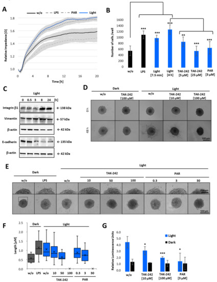 Having demonstrated that cell viability is only decreased when cells were treated with high concentrations of PAR or TAK-242 (Figure 6C), but not due to LPS or light-induced TLR4 activation (Figure 6), we next examined whether TLR4 signalling triggers cell attachment to extracellular matrix (ECM), and/or invasion through ECM. Therefore, opto-TLR4 PANC 1 cells were left untreated (w/o), pre-treated with LPS or PAR, or illuminated with light for 6 h, and attachment and spreading on collagen type I coated wells detected in real-time for further 20 h (Figure 7A). Both LPS stimulation and light-induction promoted cell attachment and spreading compared to non-treated cells, whereas PAR stimulation showed the opposite effect. To verify this data, cells were collected in non-adhering plates and were left untreated (dark), treated with LPS, or exposed to light for 7.5 min or 6 h with 5 µM or 25 µM TAK-242 or 3 µM PAR and plated on collagen type I coated wells 6 h later. As depicted in Figure 7B, LPS treatment and exposure to light (7.5 min or 6 h) significantly increased cell attachment after 30 min, whereas the TLR4/NF-κB inhibitors TAK-242 and PAR significantly decreased this effect. Since markers such as integrin β-1 or vimentin play an essential role in adhesion and invasiveness of pancreatic carcinoma cells [29], we analysed the relationship between light-induced TLR4 activation and integrin β-1 and vimentin expression. Opto-TLR4 PANC 1 cells were illuminated with light for 0–24 h and protein expression of integrin β-1, vimentin, E-cadherin, and β-actin (loading control) was analysed using western blotting. As shown in Figure 7C, light induction increased expression of integrin β-1 after 3 h significantly and that of vimentin slightly after 8 h. In comparison, E-cadherin expression was clearly diminished after 3 h and remained downregulated even after 24 h.